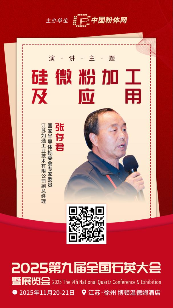 为了更深入地探讨硅微粉加工技术的创新方向与应用领域的拓展潜力,2025年11月20-21日,中国粉体网将在江苏徐州举办“2025(第九届)全国石英大会暨展览会”。届时,国家半导体标委会专家委员、江苏如通工业技术有限公司副总经理张存君,将带来题为《硅微粉加工及应用》的报告。他将结合自身深耕硅微粉领域的丰富经验,解读硅微粉加工及应用等相关内容,助力推动硅微粉产业的高质量发展。