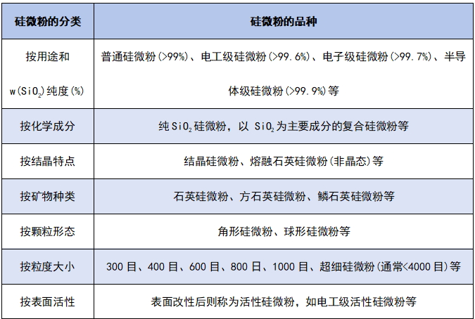 根据制作工艺分为:结晶硅微粉、熔融硅微粉、活性硅微粉、方石英硅微粉、复合硅微粉等。