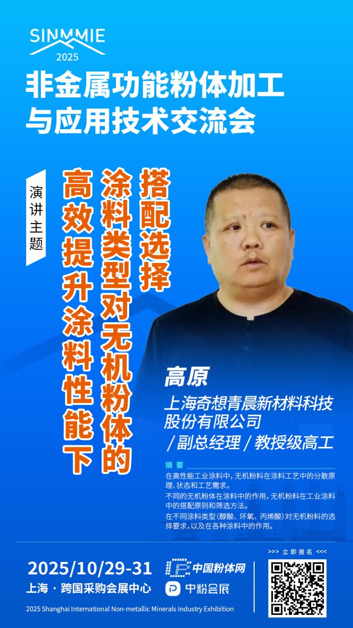 10月29-31日,北京粉体技术协会、柏德英思展览(上海)有限公司、山东中粉会展服务有限公司将在上海跨国采购会展中心联合主办“上海国际非金属矿工业展览会(SINMMIE2025)”,展会现场将同期举办“非金属功能粉体加工与应用技术交流会”,届时将邀请上海奇想青晨新材料科技股份有限公司副总经理高原作《高效提升涂料性能下,涂料类型对无机粉体的搭配选择》专题报告,现场分享无机粉体材料在高性能涂料中的应用工艺,不同无机粉体在涂料中的作用,不同涂料类型(醇酸、环氧、丙烯酸)对无机粉料的选择要求等内容。