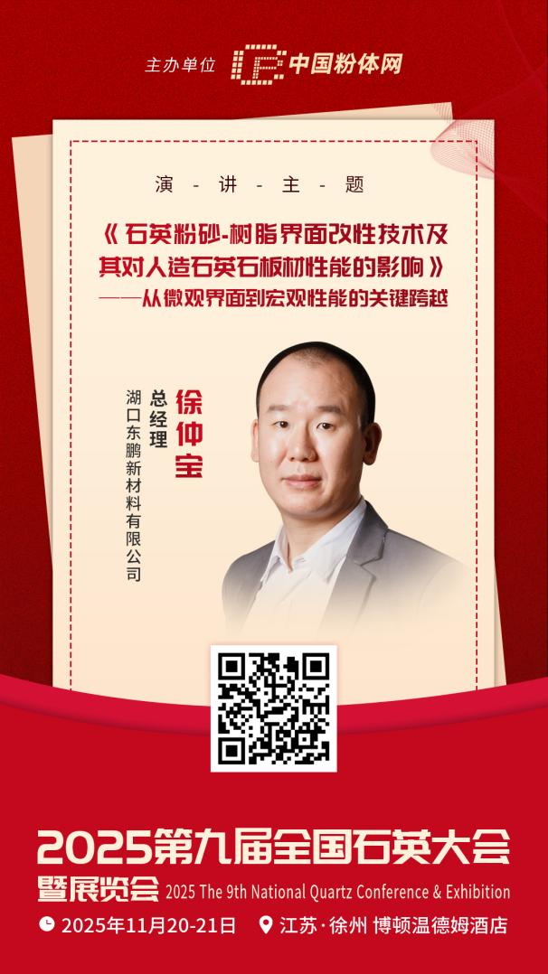 2025年11月20-21日,由中国粉体网主办的“2025第九届全国石英大会暨展览会”将在江苏徐州召开,湖口东鹏新材料有限公司总经理徐仲宝将带来题为《石英粉砂-树脂界面改性技术及其对人造石英石板材性能的影响——从微观界面到宏观性能的关键跨越》的报告,届时,他将结合公司生产研发经验,深度解读石英粉砂-树脂界面改性技术及其对人造石英石板材性能的影响。