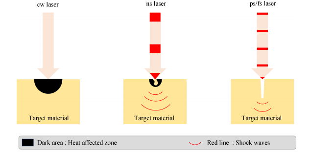 (1)由于脉冲宽度通常小于热扩散的时间,因此加工过程中带来的热影响区可以忽略不计,这通常被称为“冷加工”;