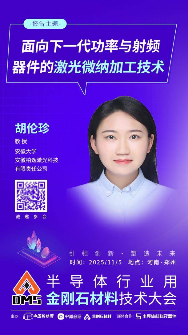 2025年11月5日,中国粉体网将在河南•郑州举办“2025半导体行业用金刚石材料技术大会”。届时,我们将邀请到安徽大学胡伦珍教授出席本次大会并作题为《面向下一代功率与射频器件的激光微纳加工技术》的报告。