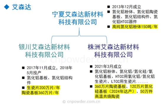 宁夏艾森达成立于2013年12月,位于宁夏石嘴山市高新技术开发区,主要生产研发氮化铝粉体、氮化铝多层线路板(HTCC)。2017 年,艾森达将核心基板生产搬到银川,并在2021年、2022年相继在株洲布局金属化、大件加工和氮化硅基板研发,形成了“三地分工、协同发展”的格局。
