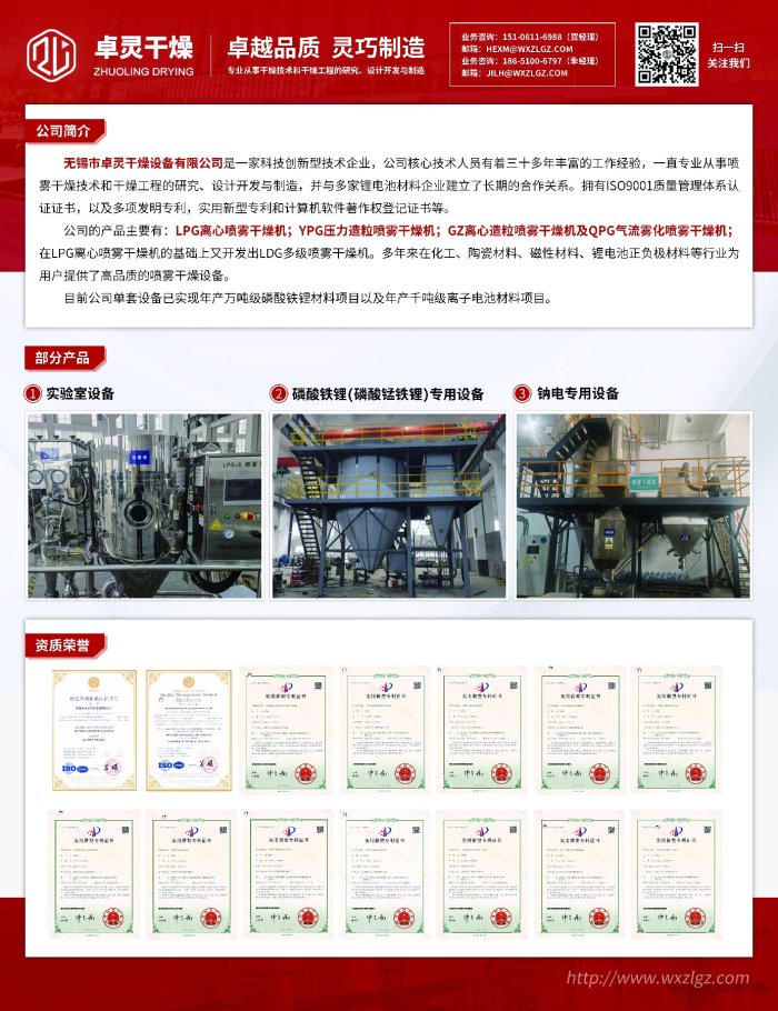 作为一家科技创新型技术企业,卓灵干燥拥有核心技术人员三十余年的丰富经验,专注于喷雾干燥技术的研究、开发与制造。公司已通过ISO9001质量管理体系认证,并拥有多项发明专利与软件著作权,为材料制备提供坚实的技术保障。