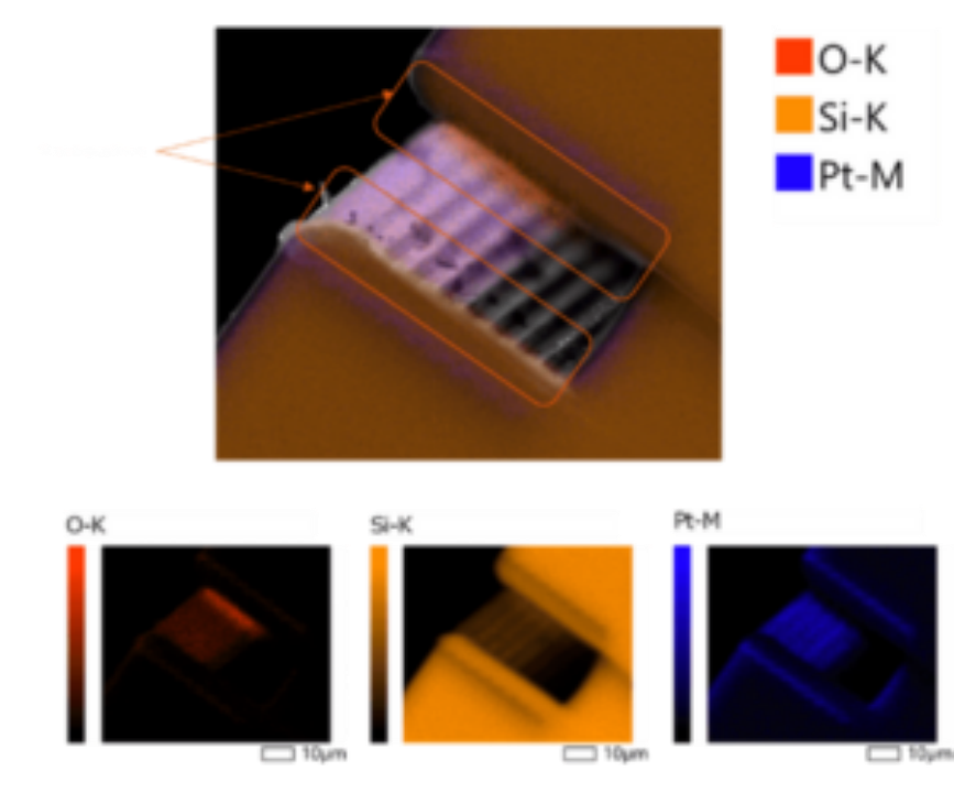 20 μm通道电容式传感器铂沉积的横截面图。EDX元素扫描结果表明,铂沿侧壁呈保形沉积