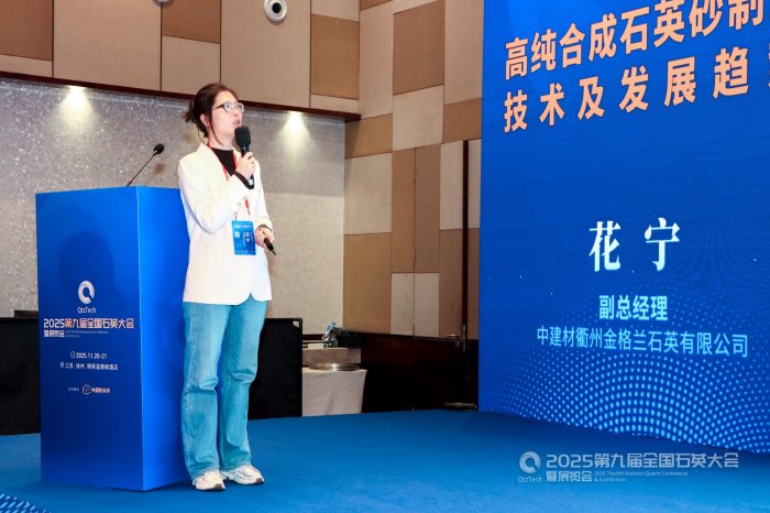 中建材衢州金格兰石英有限公司副总经理花宁(研发工程师石悦 代)作《高纯合成石英砂制造技术及发展趋势》报告