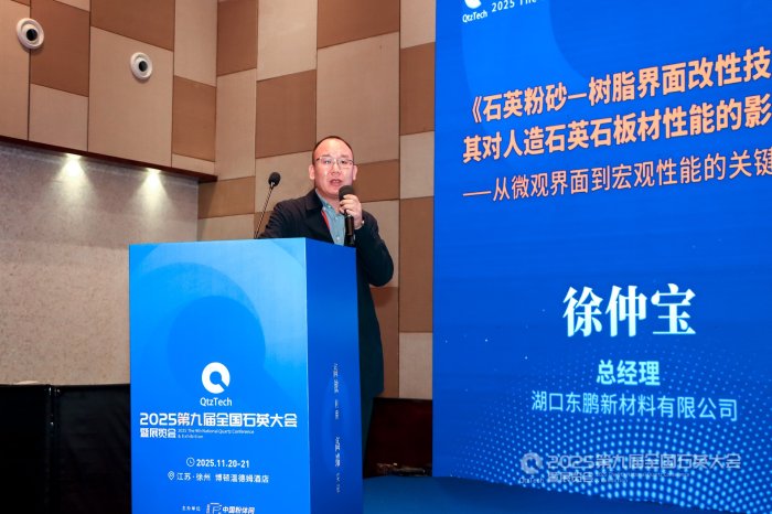 湖口东鹏新材料有限公司总经理徐仲宝作《石英粉砂-树脂界面改性技术及其对人造石英石板材性能的影响——从微观界面到宏观性能的关键跨越》报告