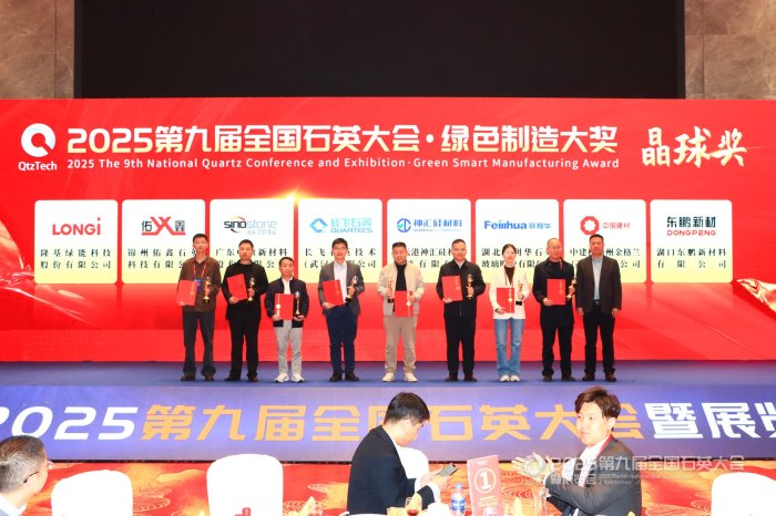 为促进参会代表之间的互动交流,11月20日晚,中国粉体网举办了“青峰之夜”答谢晚宴。晚宴开始,首先进行的是“2025全国石英大会•绿色智造大奖”晶球奖颁奖典礼,隆基绿能、菲利华、长飞石英、金格兰石英、佑鑫石英、神汇科技、中旗新材、东鹏新材等8家企业获得“晶球奖”。同时,南昌矿机集团股份有限公司、江西省青峰矿业有限公司等近50家企业获得“优秀供应商”大奖。