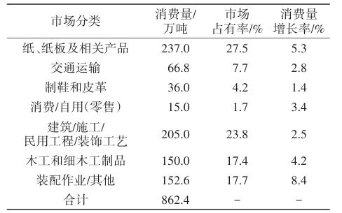 其次,纸、纸板及相关产品(增速5.3%)、木工及细木工制品(增速4.2%)等以居民消费为主的产品增速也较可观。此外,消费/自用(零售)(增速3.4%)、交通运输(增速2.8%)、建筑(增速2.5%)、制鞋和皮革(增速1.4%)也都有一定的增长,拉动了对胶粘剂产品的需求。