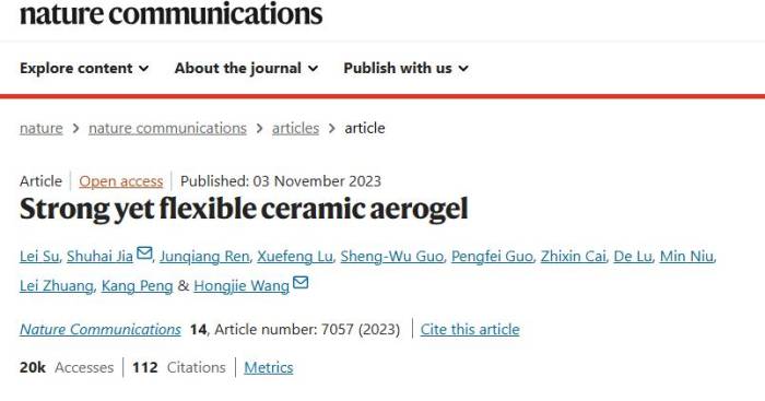 2023年11月,王红洁教授课题组基于前期在弹性陶瓷气凝胶变形和隔热机理方面的相关研究,从结构设计的角度,提出并制备了一种由碳化硅基陶瓷纳米线构筑的层状陶瓷气凝胶。