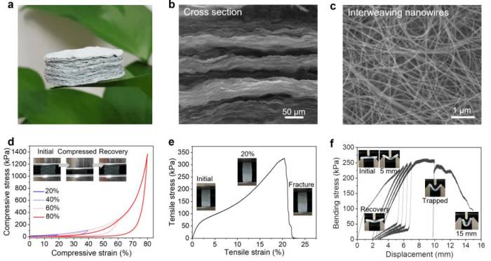 柔而强的陶瓷气凝胶:a) 宏观形貌;b) 截面层状结构;c) 层内纳米线高度交联;d) 压缩回弹性及高承载;e) 弹塑性拉伸变形及高拉强度;f) 可恢复的弯曲变形及高弯曲强度