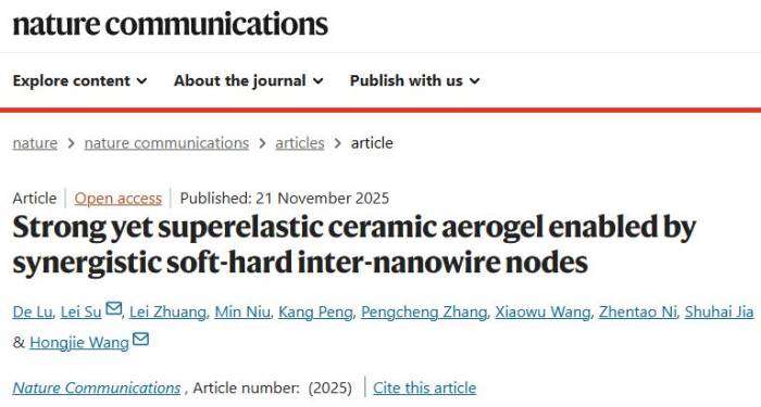 中国粉体网讯 近日,西安交通大学王红洁教授、苏磊特聘研究员课题组在自然子刊Nature Communications上面发布一篇有关新型陶瓷气凝胶的文章,该研究提出了一种创新解决方案,实现新型陶瓷气凝胶高强度与超弹性协同。