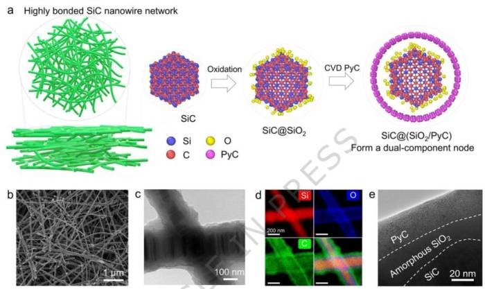 此次提出的创新解决方案,是通过设计由热解碳和无定形二氧化硅组成的双相节点增强碳化硅纳米线气凝胶,成功打破了强度与弹性之间的传统权衡。