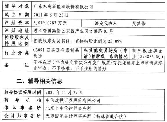 中国粉体网讯 近日,证监会网站披露,广东东岛新能源股份有限公司启动上市辅导,辅导机构为中信建投证券,这标志着这家深耕锂电负极材料领域的企业,向资本市场发起了全新冲击。