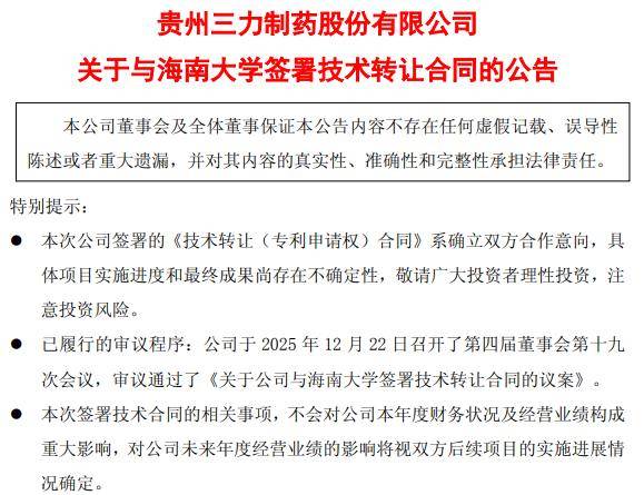 这并非三力制药今年首次大手笔投资高校研发成果。就在约半年前的6月,三力制药刚与广东药科大学签署了总金额1.5亿元的技术合同,以5000万元受让金缕半枫荷保肝相关专利,并投入1亿元共同开发1.2类中药新药。