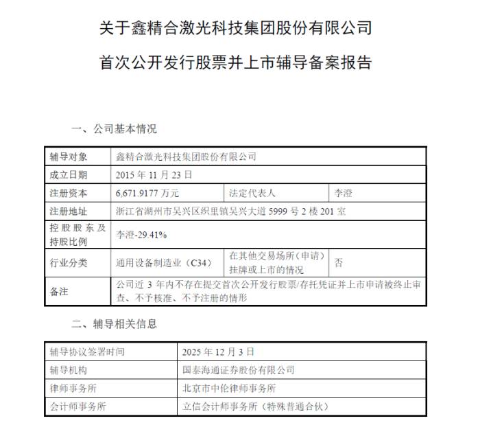 据证监会官网显示,2025年12月22日,鑫精合激光科技集团股份有限公司正式启动上市辅导,国泰海通证券担任辅导机构。这家成立于2015年11月23日的国家级专精特新“小巨人”企业向资本市场迈出了关键一步。
