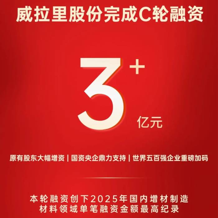 2025年12月23日,江苏威拉里官宣获得C轮融资,初始申报4.6亿元,最终择优募资近3.1亿元,投后估值约21.1亿元,估值增长48倍,创下2025年度国内增材制造材料领域单笔融资规模最高纪录。