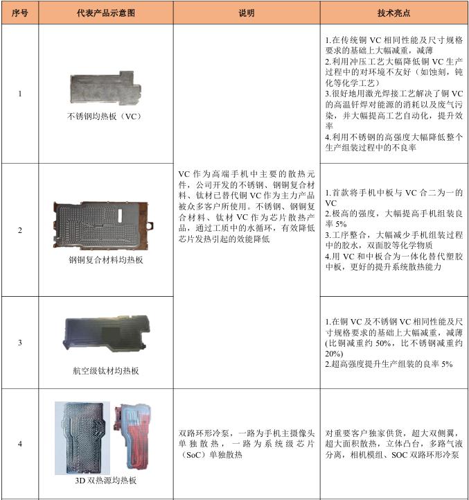 在热管与均温板领域,公司是行业内较早进行超薄热管、均温板产品研发的企业,凭借在该领域的技术积累和先发优势,公司在短时间内通过了多个国内外知名品牌终端客户的认证测试,实现相关产品的规模化量产出货。目前,公司可量产热管、均温板厚度最低可以分别做到热量均达到0.3mm、0.22mm以上,内部核心毛细结构全部实现自主生产,工艺技术处于同行业较高水平。