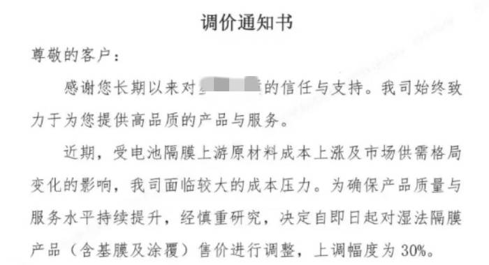 几乎在同一时间,锂电池的另一关键主材——隔膜,也吹响了涨价号角。一份在业内广为流传的调价通知书显示,某湿法隔膜一梯队企业宣布,即日起对所有湿法隔膜产品(含基膜及涂覆)售价上调30%。
