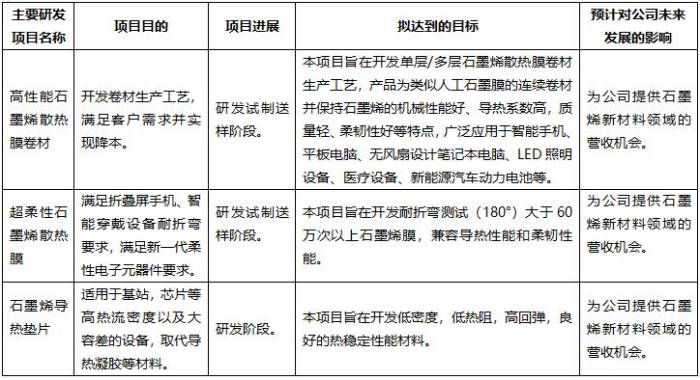公司在石墨烯热管理材料应用领域已进行产品开发,产业化推进等,在上游原材料生产技术和产品持续升级的同时,着重开展石墨烯导热材料在电子产品终端客户的应用导入,推进石墨烯在热管理领域的应用和市场转化。同时,在下一代性能迭代产品方面持续加大研发创新投入并取得了积极进展。
