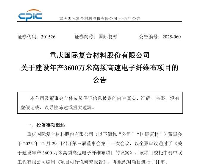 《重庆国际复合材料股份有限公司关于建设年产3600万米高频高速电子纤维布项目的公告》