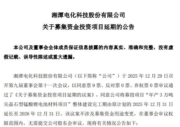 中国粉体网讯 12月30日,湘潭电化发布公告,宣布将其募投项目“年产3万吨尖晶石型锰酸锂电池材料项目”的整体建设完工期从2025年12月31日延长至2026年12月31日。