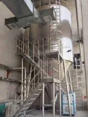 空气经过过滤和加热,进入干燥器顶部空气分配器,热空气呈螺旋状均匀地进入干燥室。料液经塔体顶部的高速离心雾化器,(旋转)喷雾成极细微的雾状液珠,与热空气并流接触,在极短的时间内可干燥为成品。成品连续地由干燥塔底部和旋风分离器中输出,废气由风机排空。