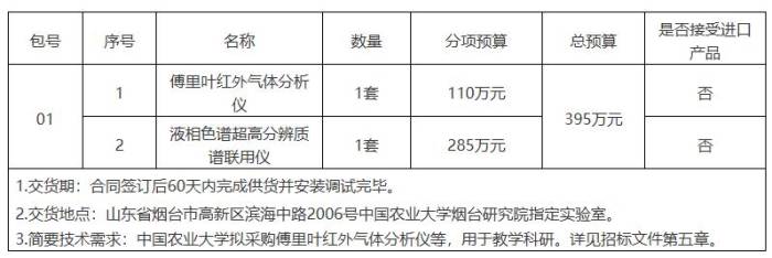 项目名称:中国农业大学烟台研究院采购傅里叶红外气体分析仪、液相色谱超高分辨质谱联用仪项目