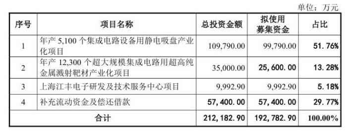 此前,公司拟募集资金不超过19.48亿元,用于年产5100个集成电路设备用静电吸盘产业化项目、年产12300个超大规模集成电路用超高纯金属溅射靶材产业化项目、上海江丰电子研发及技术服务中心项目以及补充流动资金偿还借款。