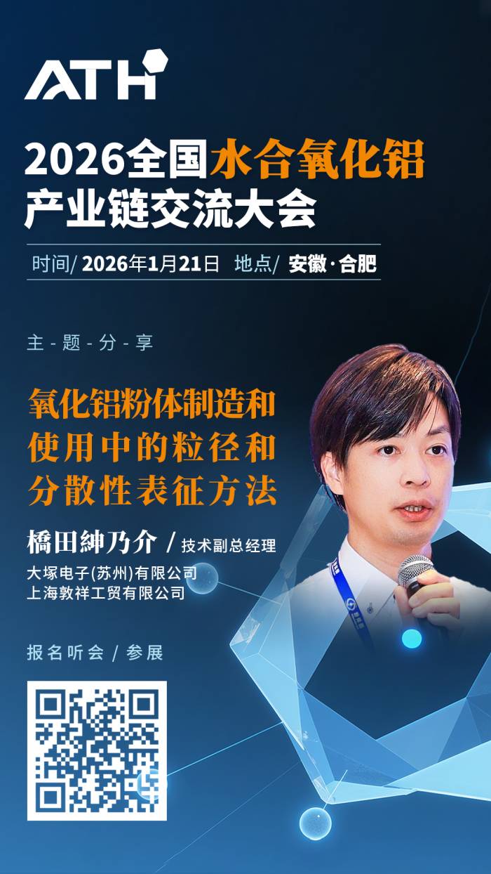1月21日,中国粉体网将在安徽合肥举办“2026全国水合氧化铝产业链交流大会”。会务组邀请到大塚电子(苏州)有限公司技术副总经理橋田紳乃介莅临大会现场,并作题为《氧化铝粉体制造和使用中的粒径和分散性表征方法》的报告。