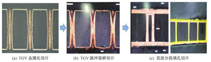 厚径比5∶1的TGV蝶形电镀过程切片 来源:《玻璃基芯板制作流程概述》(梁智斌等)