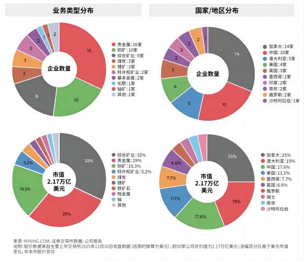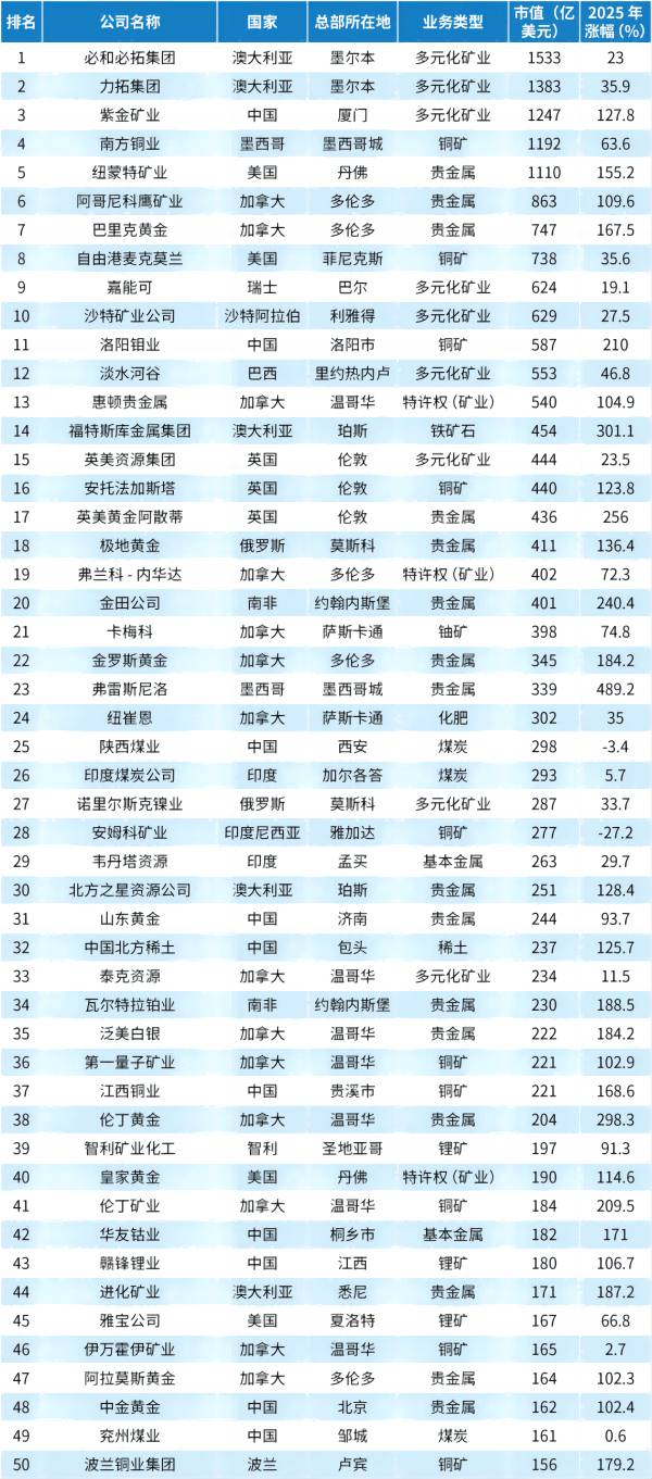 中国矿业军团在2025年表现耀眼,十家企业入围全球50强,无论是上榜数量还是市值占比都位居世界前列。这一成绩体现了中国在全球矿业领域影响力持续提升。中国上榜企业呈现鲜明的多元化布局特征。