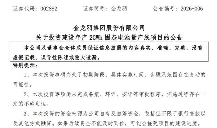 1月12日,金龙羽公告称,其控股子公司金龙羽新能源(深圳)有限公司拟在深圳市大鹏新区投资建设年产2GWh的固态电池量产线项目,项目估算总投资约12亿元。其中,设备采购、厂房改造装修及租金等建设投资约9亿元,建设周期预计为24个月。