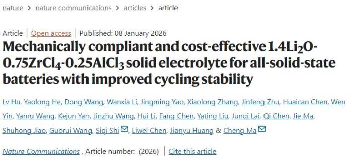 1月8日,中国科学技术大学马骋教授团队针对全固态电池在循环时因为需要维持良好界面接触而过于依赖外部压力、难以实际应用的问题提出了一种低成本的解决方案——一种新型氧氯化物固态电解质1.4Li2O-0.75ZrCl4-0.25AlCl3(LZACO)。生产成本降至43.70美元/升,显著低于93.50美元/升的商业化阈值,为全固态电池的实用化提供了新路径。该成果以“Mechanically compliant and cost-effective 1.4Li2O-0.75ZrCl4-0.25AlCl3 solid electrolyte for all-solid-state batteries with improved cycling stability”为题发表在《自然·通讯》上。