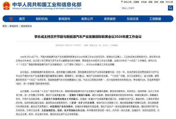 1月13日,节能与新能源汽车产业发展部际联席会议2026年度工作会议在京召开。联席会议召集人,工业和信息化部党组书记、部长李乐成主持会议并讲话。会议强调,提升产业链供应链自主可控能力,实施新一轮重点产业链高质量发展行动,加强标志性产品、基础材料、工具软件等攻关布局,加快突破全固态电池、高级别自动驾驶等技术。