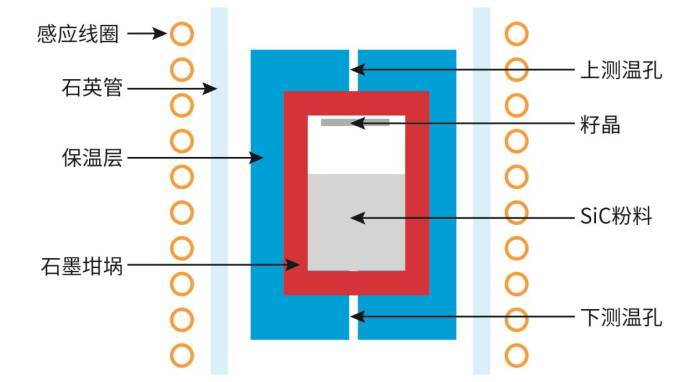 以第三代半导体SiC单晶生长为例,SiC晶体生长技术主要包括物理气相传输(PVT)法、液相外延(LPE)技术及高温化学气相沉积(HTCVD)法。其中,PVT法因生长质量高、可控性好而得到广泛应用。在PVT生长SiC晶体过程中,通常以SiC粉料为原料,在高温(通常超过2000℃)和低压(接近真空或惰性气氛)条件下发生分解,生成多种气相物质,经输运后在石墨坩埚顶部的籽晶表面反应并结晶。