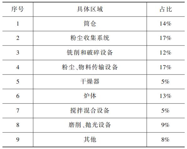 粉尘爆炸常见区域中,粉尘收集系统和粉尘、物料传输设备占比最大,占比达到17%,其次是储存粉尘的筒仓,占比14%。这些也是目前粉尘爆炸防控技术装备研发的重点领域。