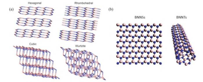 其中h-BN是以sp2杂化方式连接的二维原子晶体,与石墨结构相似,由B原子和N原子交替排列组成的无限延伸的六边形蜂窝结构。对h-BN进行剥离、沉积,可以得到氮化硼纳米片(BNNSs)、氮化硼纳米颗粒(BNNPs)、氮化硼纳米管(BNNTs)、氮化硼纳米纤维(BNNFs)等适用于不同实际应用需求的BN纳米材料。