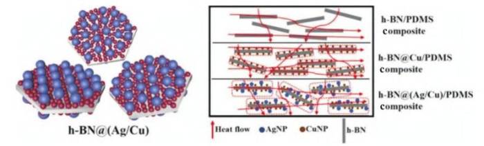 多元导热填料。h-BN与多种导热填料进行杂化组合,已成为近几年制备高导热复合材料的研究热点。通过多元填料杂化高分子基体,极大丰富了高分子基复合材料内部的导热路径,有利于声子沿着最短路径进行能传递,提高材料的导热速率。