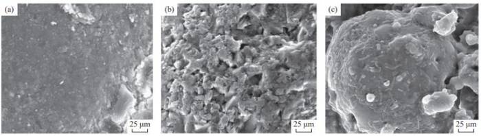 细菌在石英表面附着以及浸出前后SEM形貌图:(a)细菌在石英表面作用前;(b)细菌在石英表面作用后;(c)细菌附着在石英表面