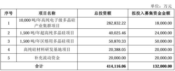 根据招股书,鑫华科技本次拟公开发行不低于16507.94万股,占发行后总股本比例不低于10%,募集资金扣除发行费用后将投向五大项目:10000吨/年高纯电子级多晶硅产业集群项目(拟投1.8亿元)、1500吨/年超高纯多晶硅项目(拟投2.4亿元)、1500吨/年区熔用多晶硅项目(拟投5亿元)、高纯硅材料研发基地项目(拟投2亿元)以及补充流动资金(拟投2亿元)。