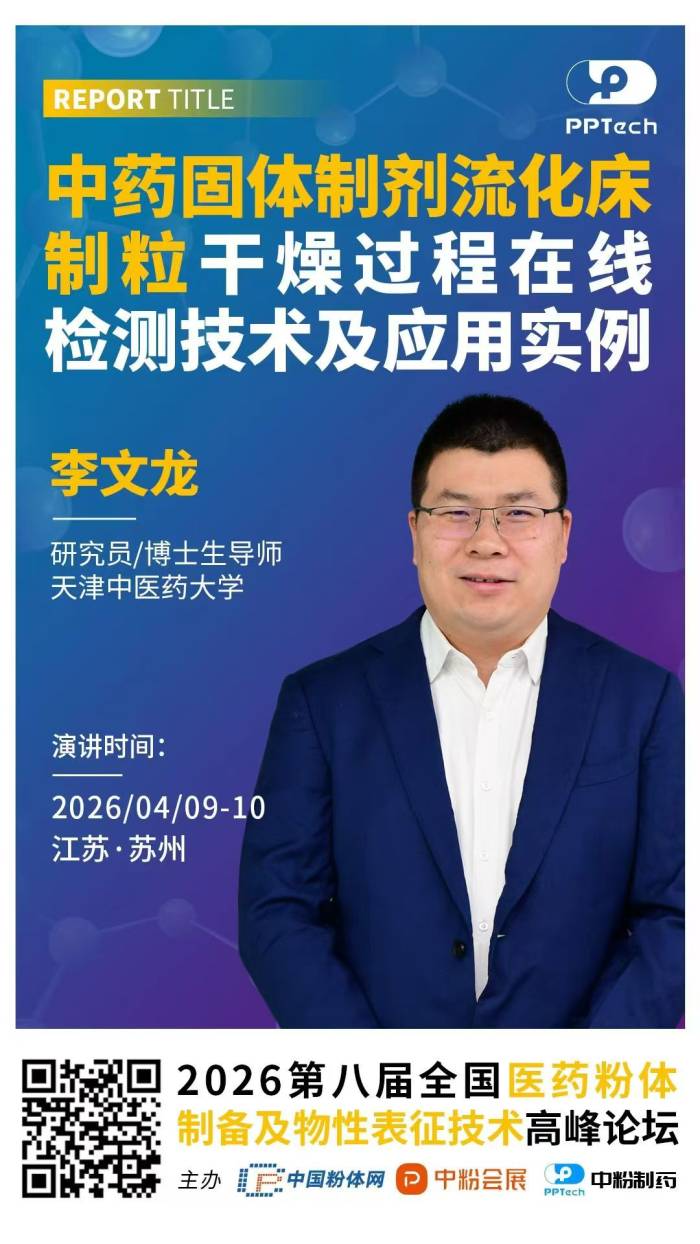 以“从粉体技术,论制药工艺”为主题,2026年4月9-10日中国粉体网将在江苏苏州白金汉爵酒店举办“2026第八届全国医药粉体制备及物性表征技术高峰论坛”。天津中医药大学李文龙研究员将为大家带来《中药固体制剂流化床制粒干燥过程在线检测技术及应用实例》的主题报告。报告聚焦流化床制粒干燥过程的在线检测技术研究进展,系统介绍近红外光谱(NIR)、拉曼光谱、在线粒径分析仪及多传感器融合等过程分析技术(PAT)的原理与实施策略。将通过分享中药浸膏粉体、复方颗粒等典型品种的工业应用实例,阐述如何建立关键质量属性(含水率、粒径分布、堆密度等)的实时预测模型,实现从"经验驱动"向"数据驱动"的工艺管控模式转变。报告还将探讨在线检测技术在中药连续制造中的拓展应用前景,以及面临的挑战与解决思路,为中药制药过程数字化、智能化升级提供技术参考。