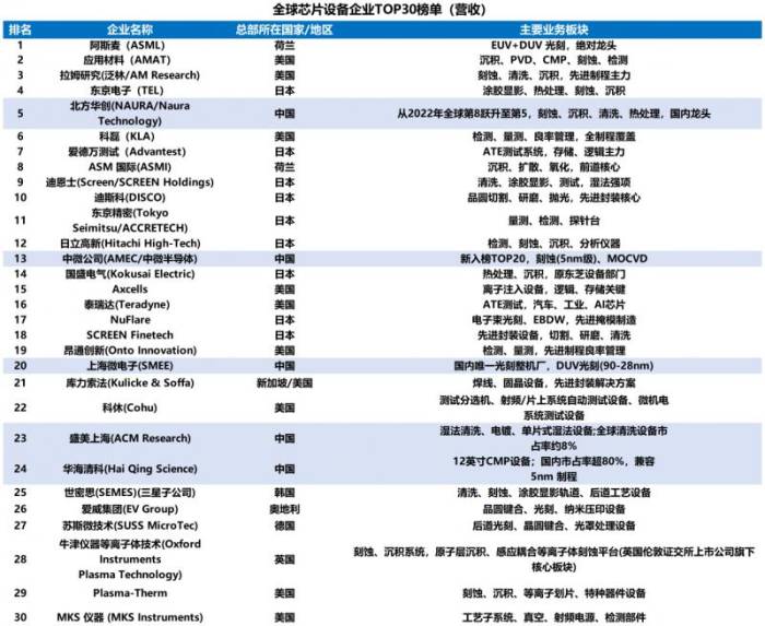 中国粉体网讯 近日,据《日经亚洲》援引日本研究机构Global Net数据显示,2025年全球芯片设备制造商前30强榜单中,中国企业历史性地占据了五席:北方华创从2022年全球第八跃升至第五,中微公司、上海微电子成功跻身TOP20,盛美上海、华海清科进入全球前30。日本调查公司Techno Systems Research数据显示,中国半导体设备本土制造率已达20%-30%,较三年前的10%实现翻倍增长。