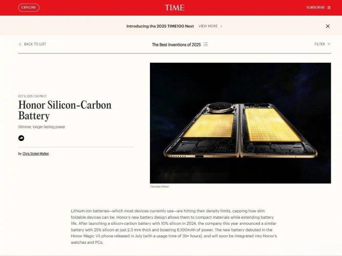 值得一提的是,针对AI手机算力飙升、功耗剧增及折叠屏对电芯超薄化的严苛要求,耀石锂电推出第一代手机半固态电池并成功搭载荣耀Magic V5,实现三项全球第一:全球首家量产900Wh/L高能量密度电芯,搭配4C/100W超快充;打造2.3mm全球最薄电芯;攻克>25%高硅负极膨胀难题,成为全球唯一将电芯膨胀率抑制至10%以下的企业,实现长续航、超快充、超薄型三重突破。该电芯获评美国《时代周刊》2025年全球300项创新发明之一。