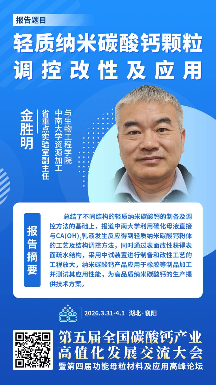 2026年3月31日-4月1日,由中国粉体网主办的“第五届全国碳酸钙产业高值化发展交流大会暨第四届功能母粒材料及应用高峰论坛”将在湖北·襄阳举行。届时将邀请中南大学金胜明教授作《轻质纳米碳酸钙颗粒调控改性及应用》专题报告,分享中南大学纳米碳酸钙制备技术、结构调控方法以及在橡胶等制品中的应用成果等。