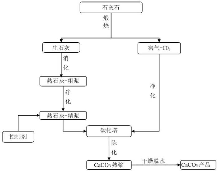 Ca2+—H2O—CO32-体系和Ca2+—R—CO32-(R为有机介质)体系实现。主要流程如下图,主要技术核心是需要适当的控制剂来调控碳酸钙晶体形貌与晶型。
