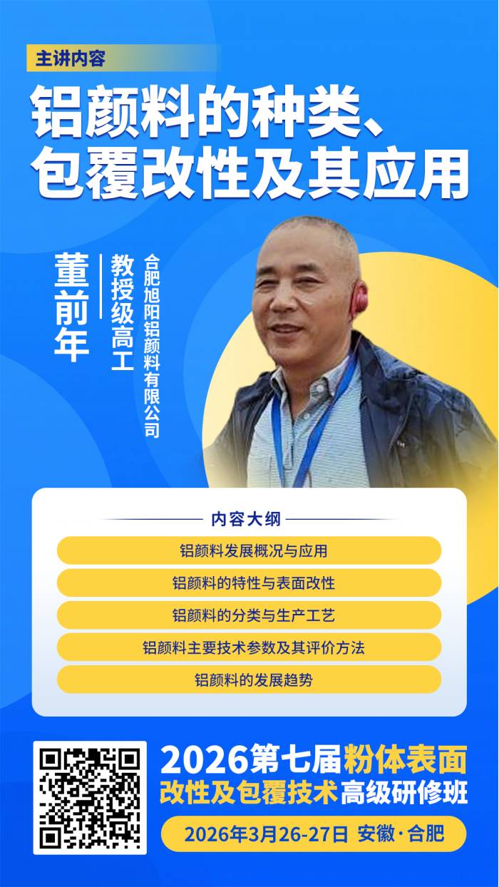 3月26-27日举办的第七届粉体表面改性及包覆技术高级研修班特邀合肥旭阳铝颜料有限公司研发副总董前年做报告《铝颜料的种类、包覆改性及其应用》,介绍铝颜料的种类、特性、改性方法及发展趋势,帮助大家更科学地应用铝颜料,推动其在各领域的合理应用与产业升级。